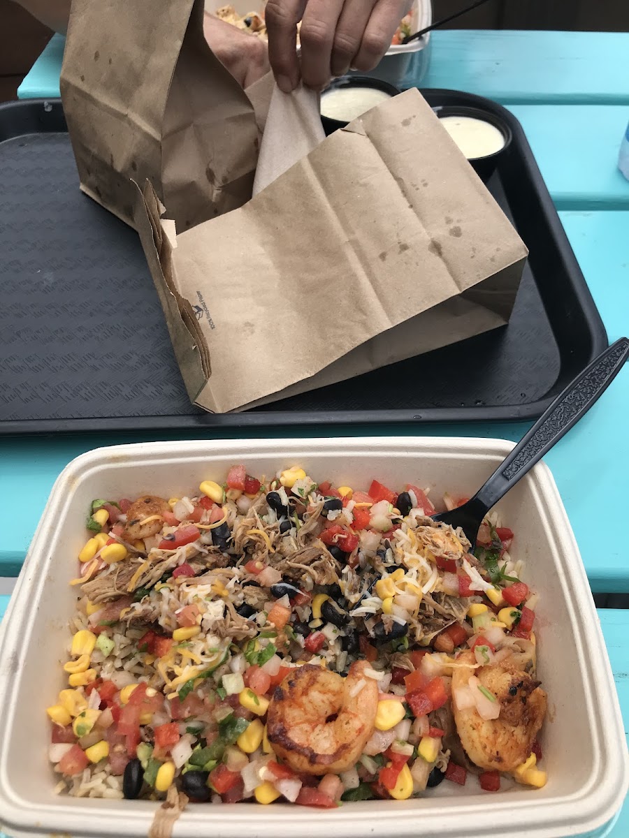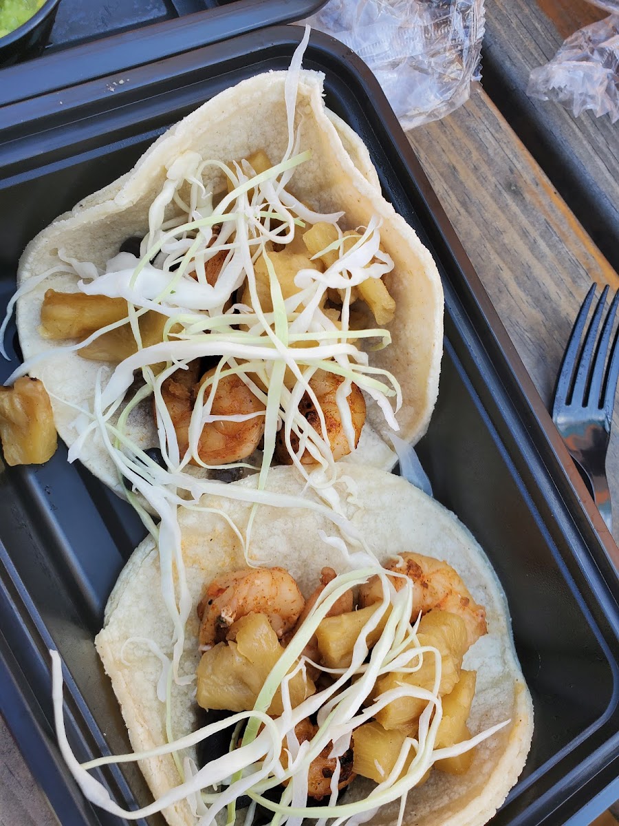 - Soft corn tacos loaded with grilled chicken, pulled pork, and succulent shrimp topped with corn salsa, grilled pineapple, pinto beans, and avocado.